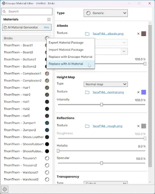 Enscapeマテリアルエディタ内で、画像から直接マテリアルを生成できるようになりました。「マテリアルを生成」をクリックすると、シンプルなCosmosウィンドウで写真やテクスチャをアップロードでき、Enscapeはすべてのマップが適用された完全なマテリアルを返します。新しいマテリアルはエディタに自動的に表示されるため、作業を中断することなく作業を続けることができます。この初期ベータ版はスピードと利便性に重点を置いており、今後のリリースでさらに多くの機能を追加する予定です。