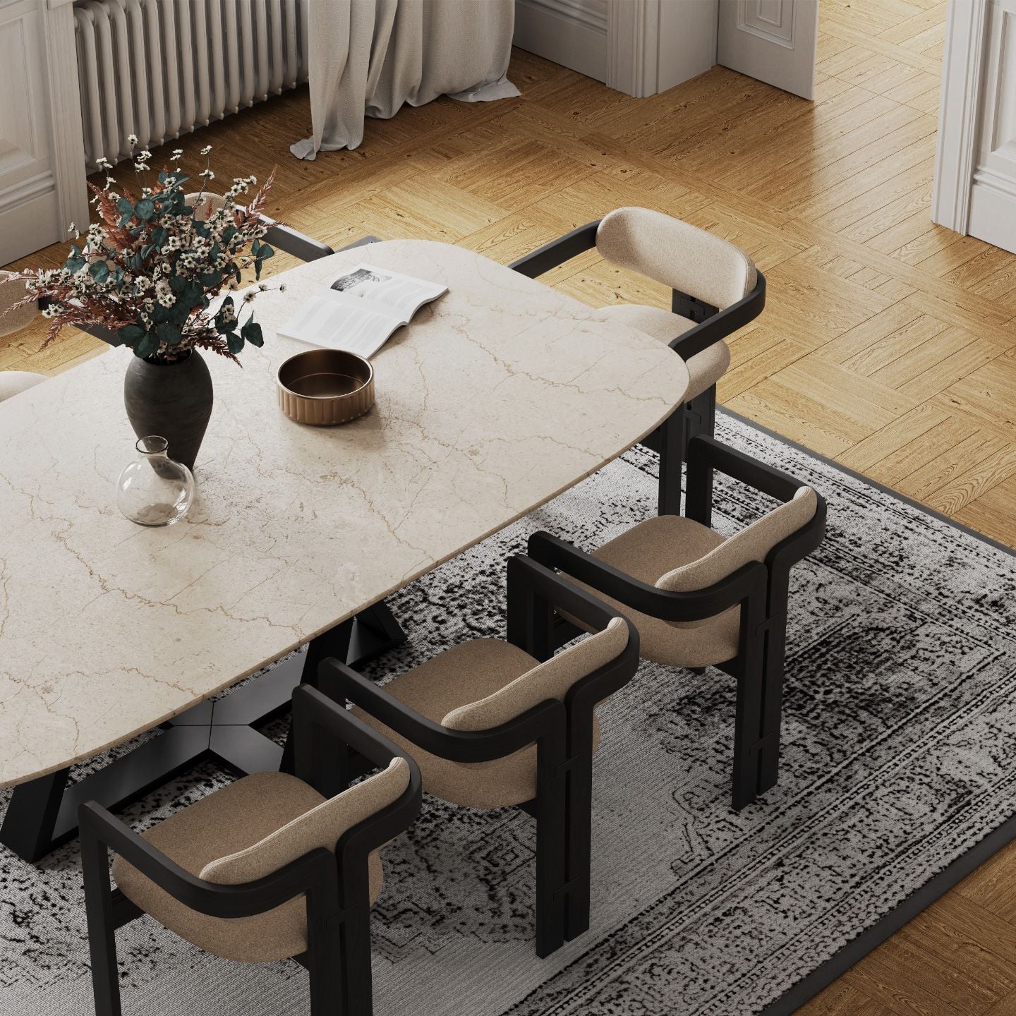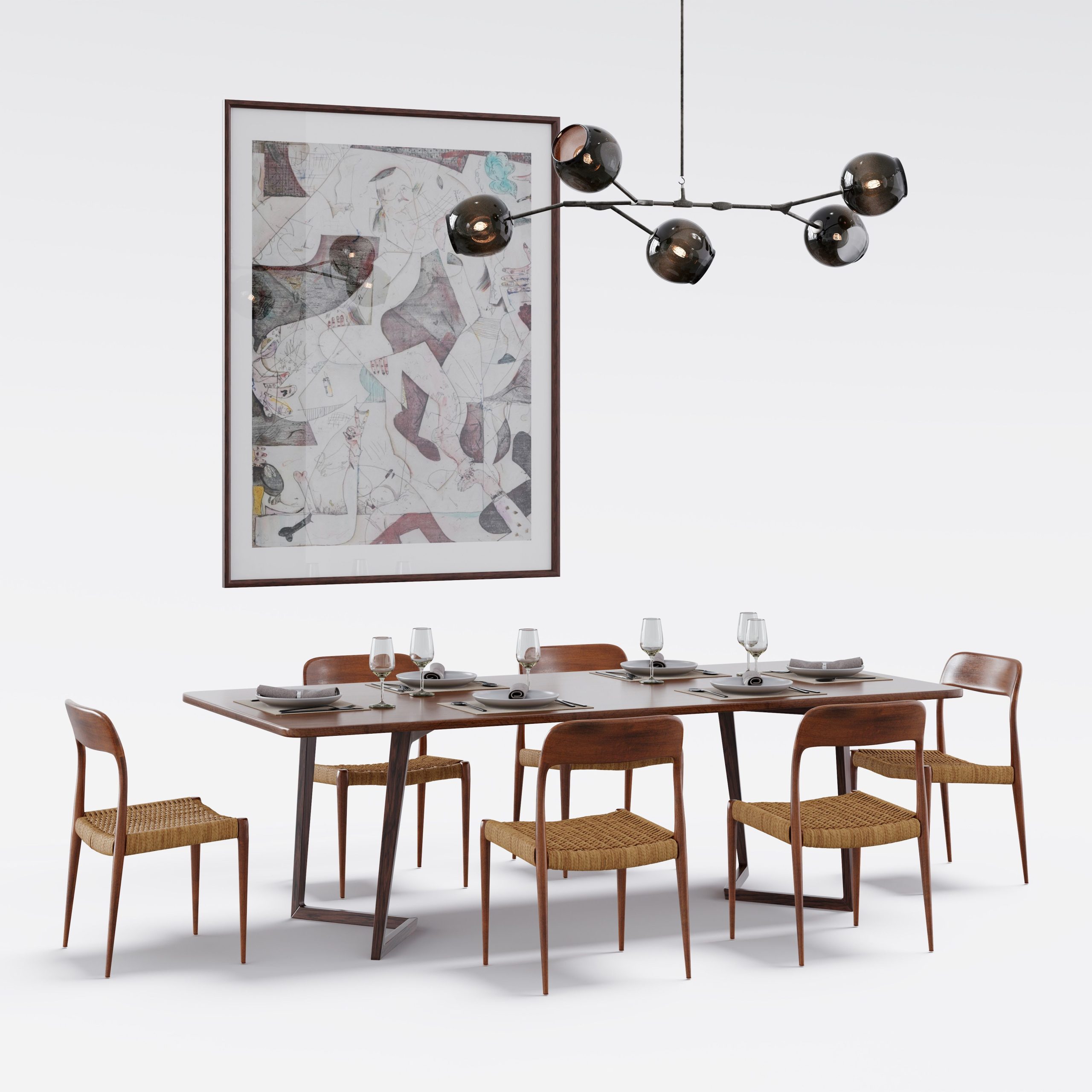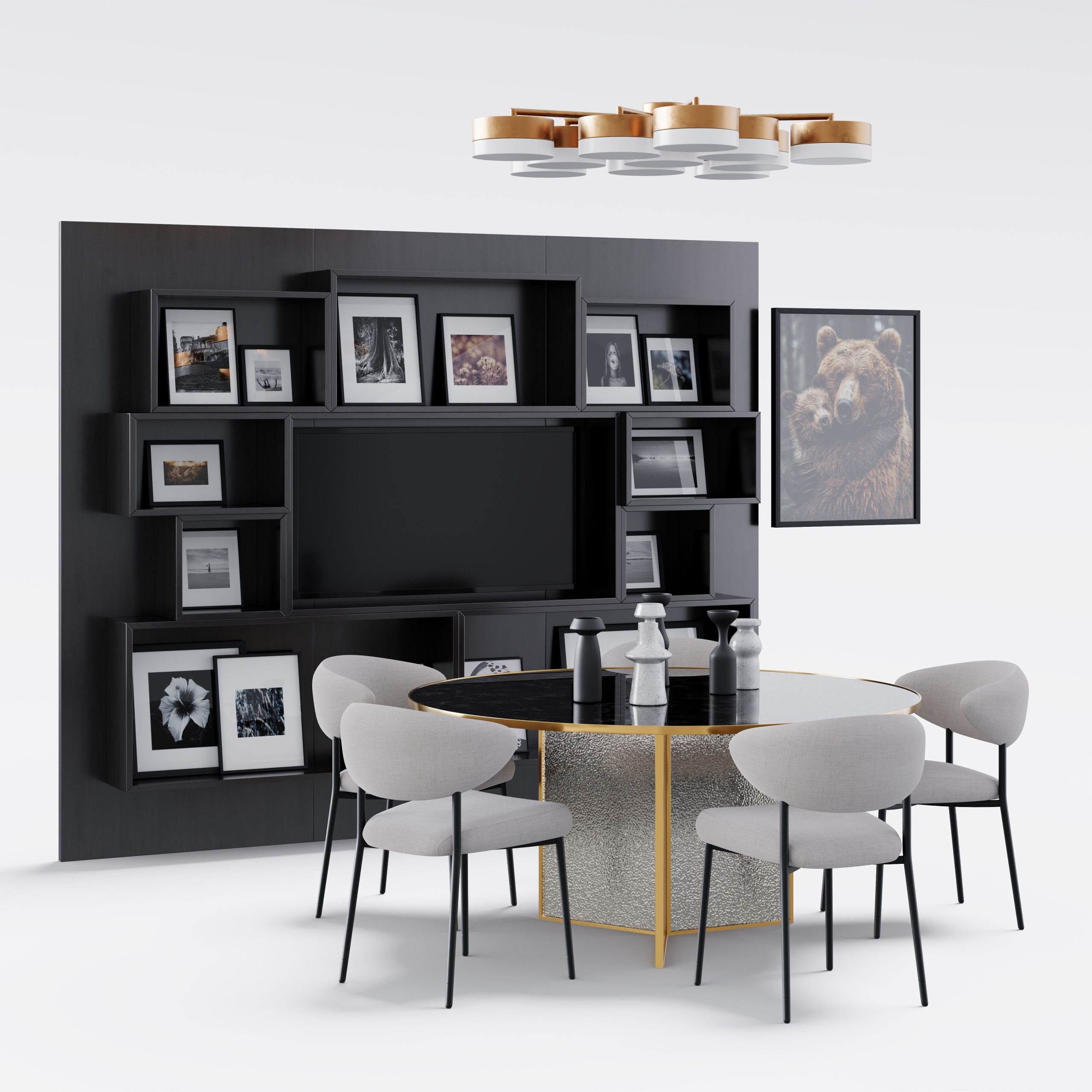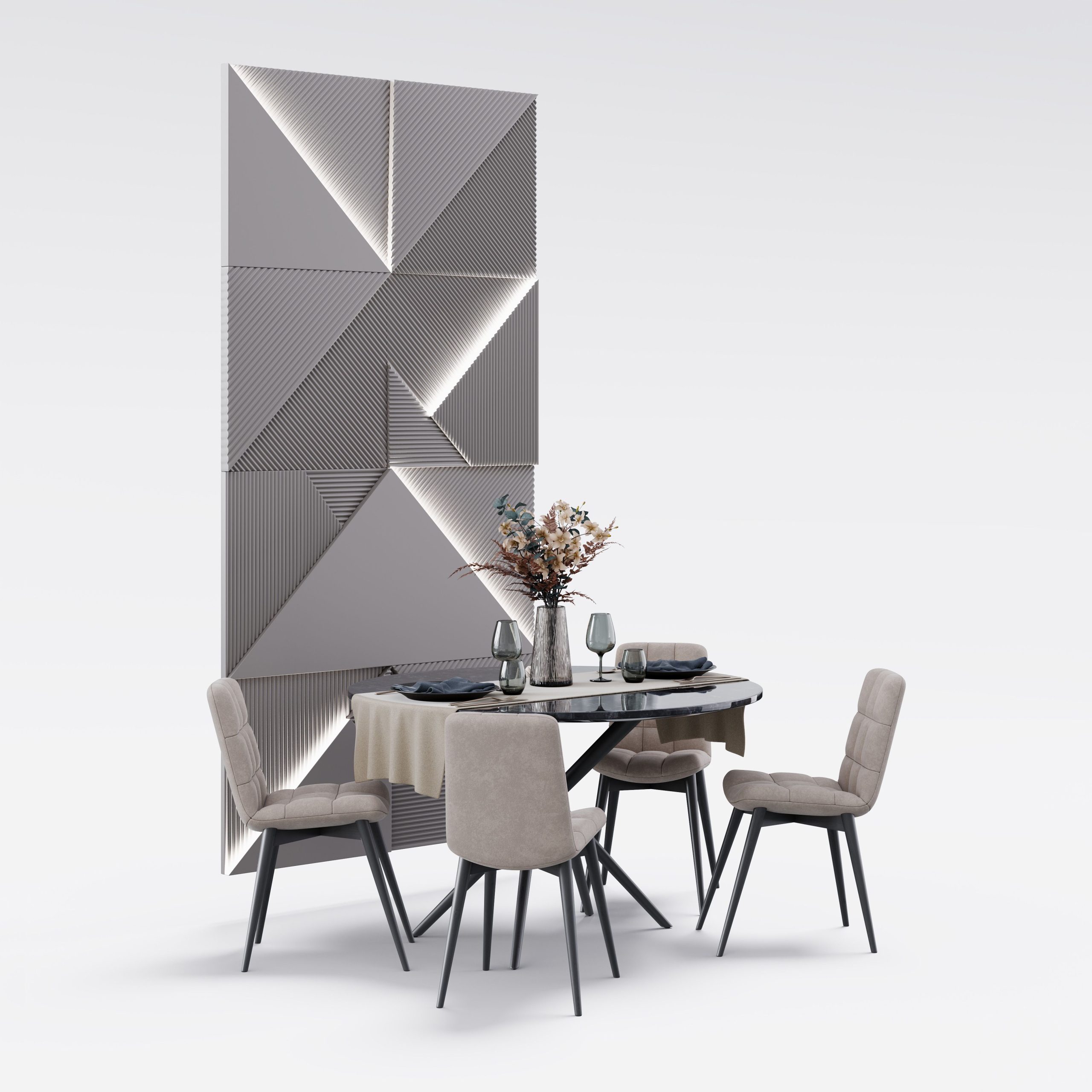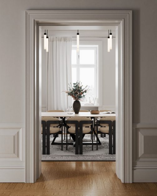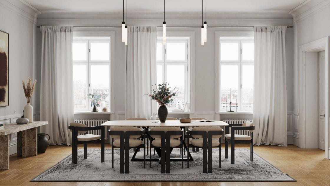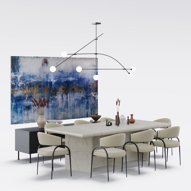 Archmodels vol. 306 は、建築ビジュアライゼーション向けの「ダイニングセット」40種類を収録したコレクションです。合計400点以上の個別3Dモデルを含みます。各セットには、テーブル、椅子、ペンダント照明、壁面装飾が含まれており、追加の配置作業なしでそのまま使用できます。スタイルは、北欧系ミニマルからミッドセンチュリーモダン、さらに大胆なアールデコ風の構成まで幅広く揃っています。多彩な素材表現とカラーパレットにより、さまざまなプロジェクトのテイストに合わせられます。