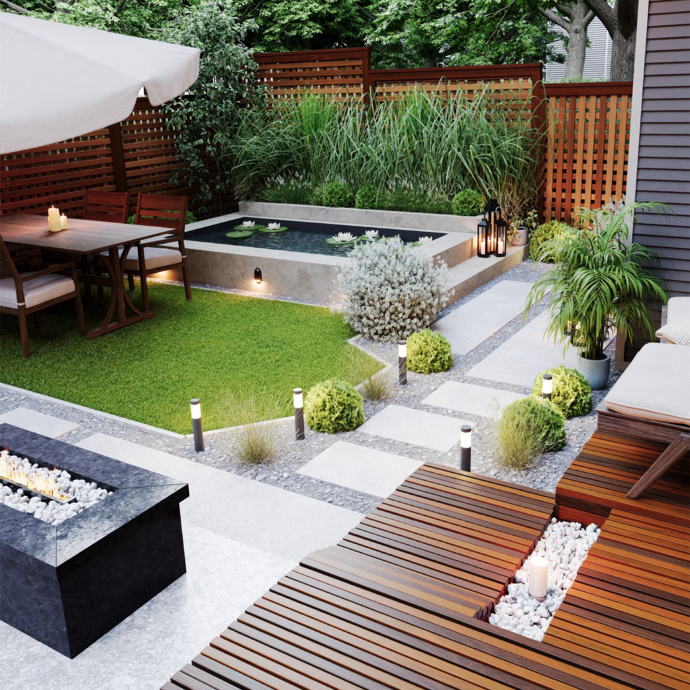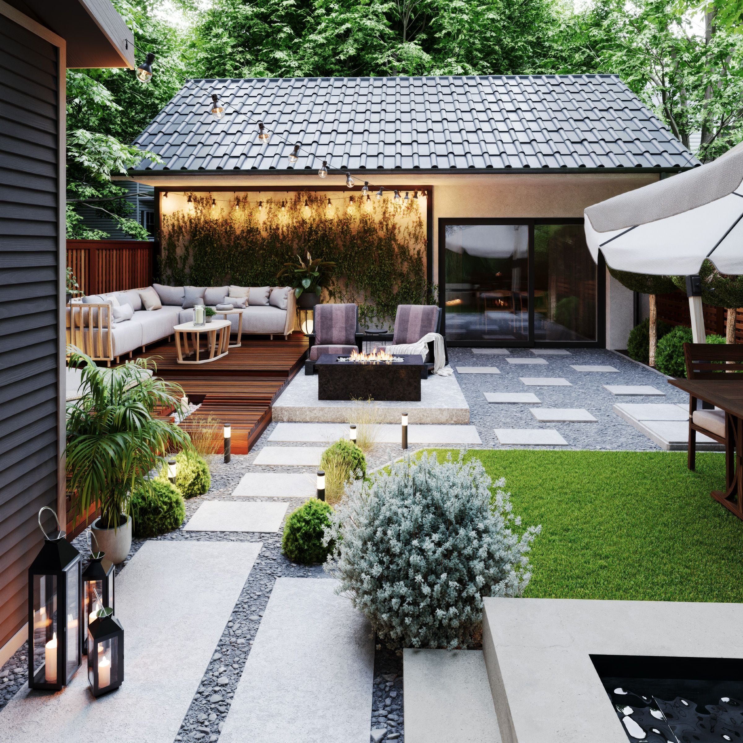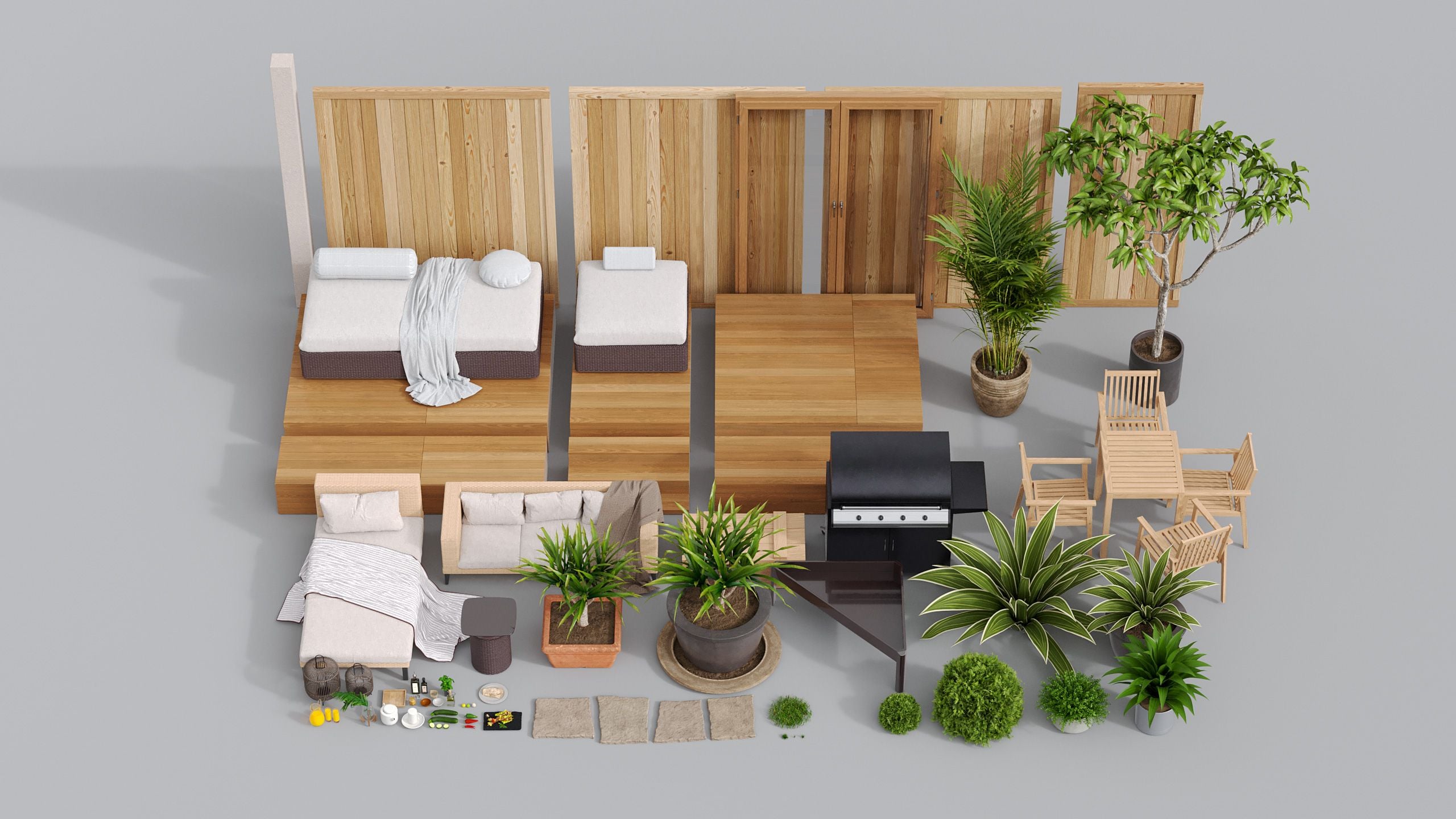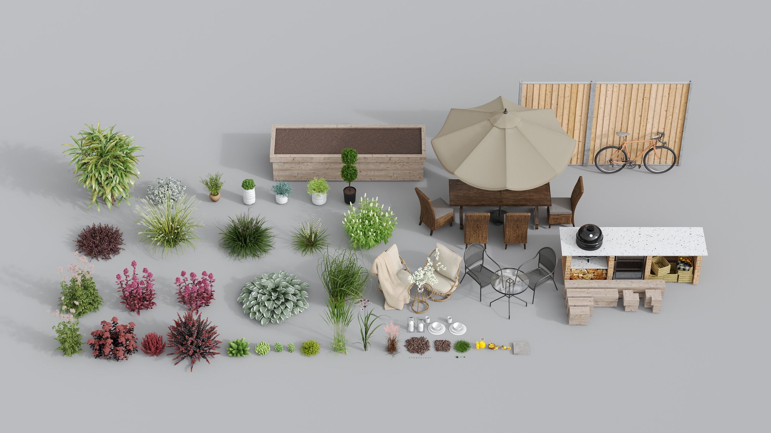 このコレクションには、即レンダリング可能な 小さく魅力的な庭の完全シーンが6種類収録されています。都会の小さなパティオから郊外のくつろげる空間まで、各環境には 焚き火スペース、屋外ダイニング、BBQステーション、屋根付きのアウトドアリビングなどが設けられています。