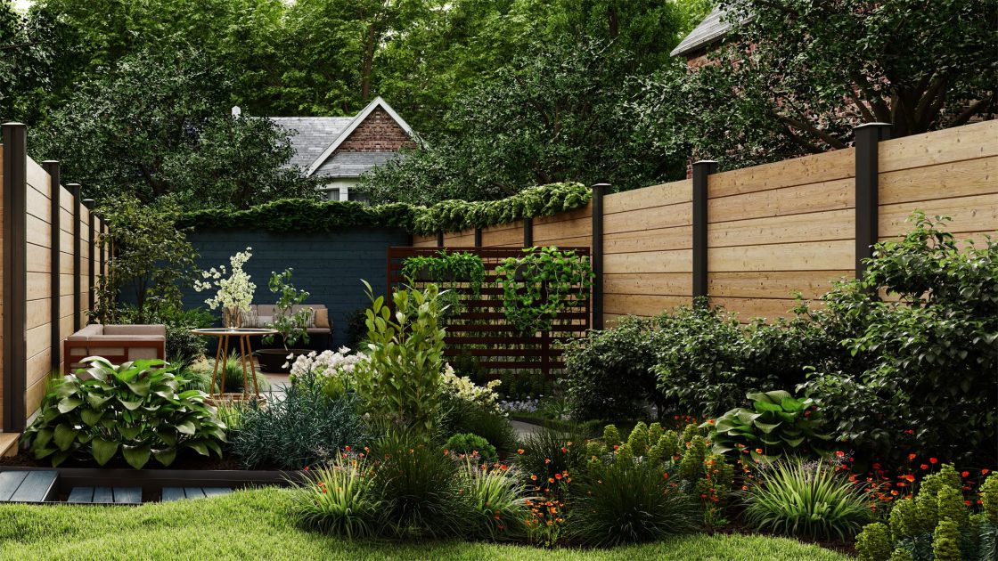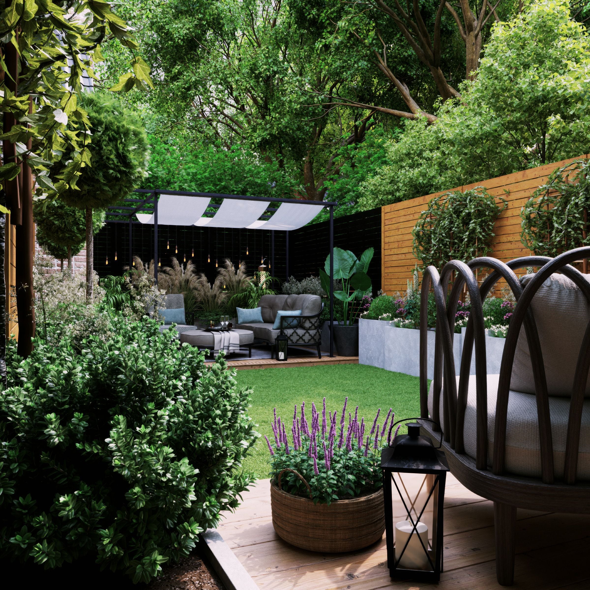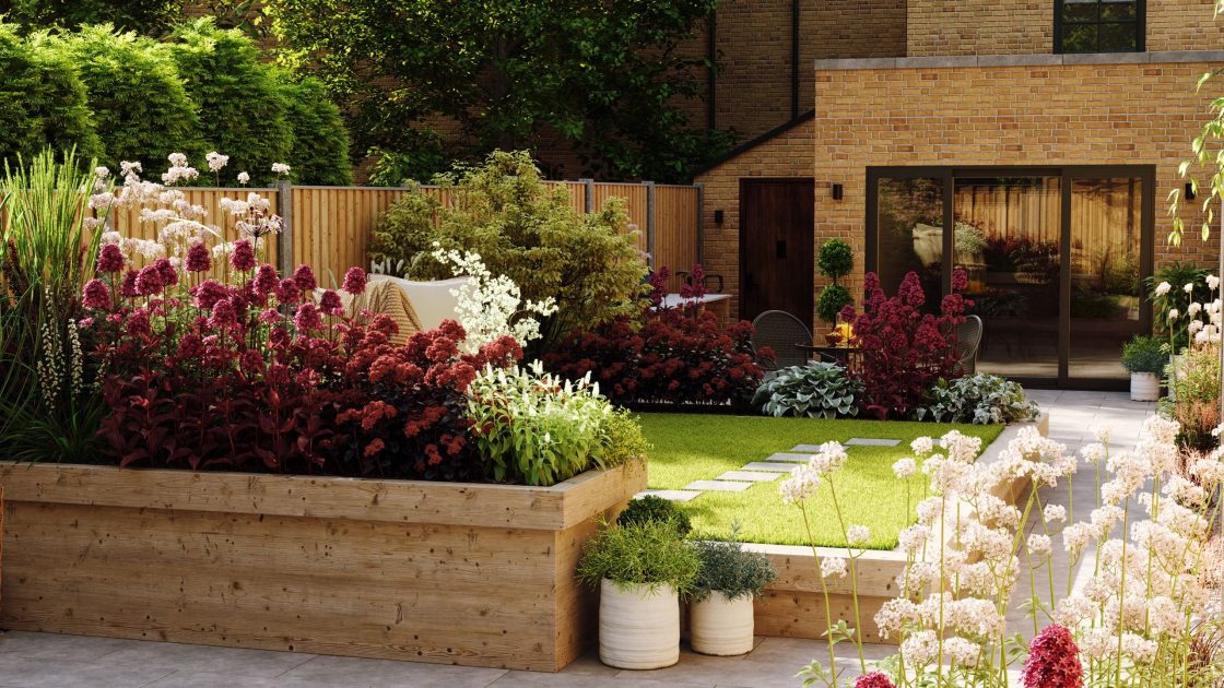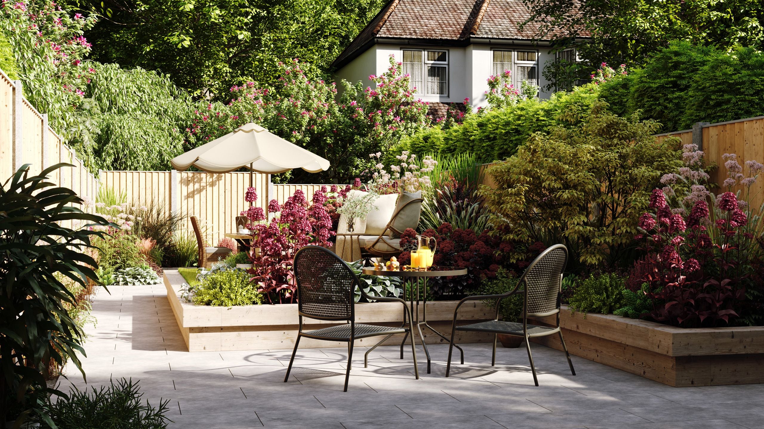 シーンは、モダンでミニマルなデッキ空間、花咲く多年草が彩るロマンチックなコテージガーデン、雰囲気のある照明を備えたリゾート風スペースなど、多彩なテイストを網羅。機能的なハードスケープ(舗装・デッキ等)と、豊かでレイヤーのある植栽のバランスが取れた構成になっています。