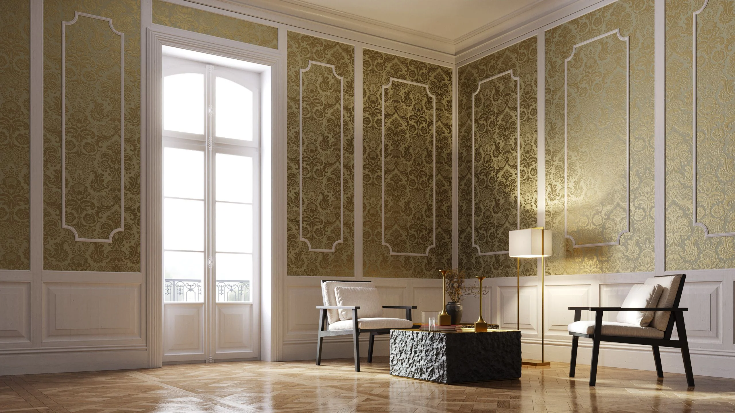 ミッドセンチュリーや高級製品のショーケースに最適な、装飾的なディテール、シャンデリア、洗練されたインテリアが特徴のスタイリッシュなヨーロピアンタウンハウス。