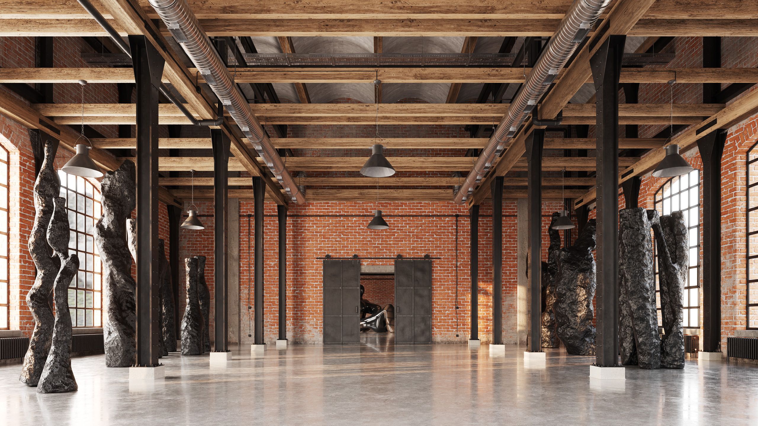 大規模な展示会やモダンなディスプレイに最適な、レンガの壁、鉄骨梁、そしてドラマチックな自然光を備えた、ポストインダストリアル風のロフトホール。