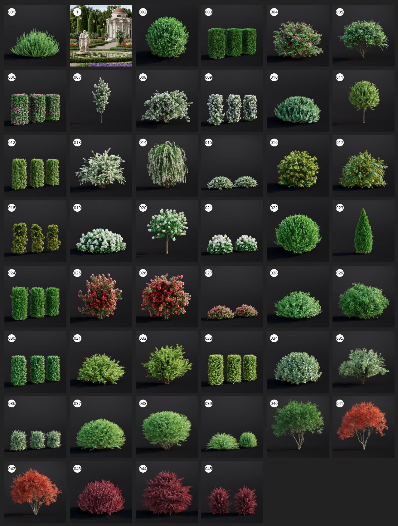 Archmodels vol. 307 は、建築ビジュアライゼーション向けの庭園用低木・生け垣 45モデルを収録したコレクションです。15種類の代表的な観賞樹種を、刈り込まれたコンパクトな低木・成熟した自然樹形・生け垣(列植)の3バリエーションで用意しており、住宅から商業施設まで幅広いランドスケープシーンに最大限の柔軟性をもたらします。